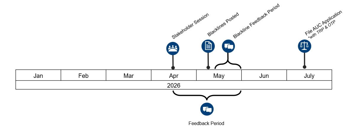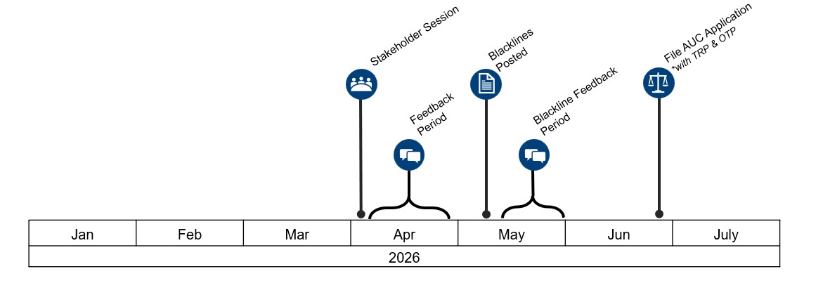 AESO will release the draft ISO Tariff Terms & Conditions blacklines and request stakeholder feedback prior to drafting its AUC application.