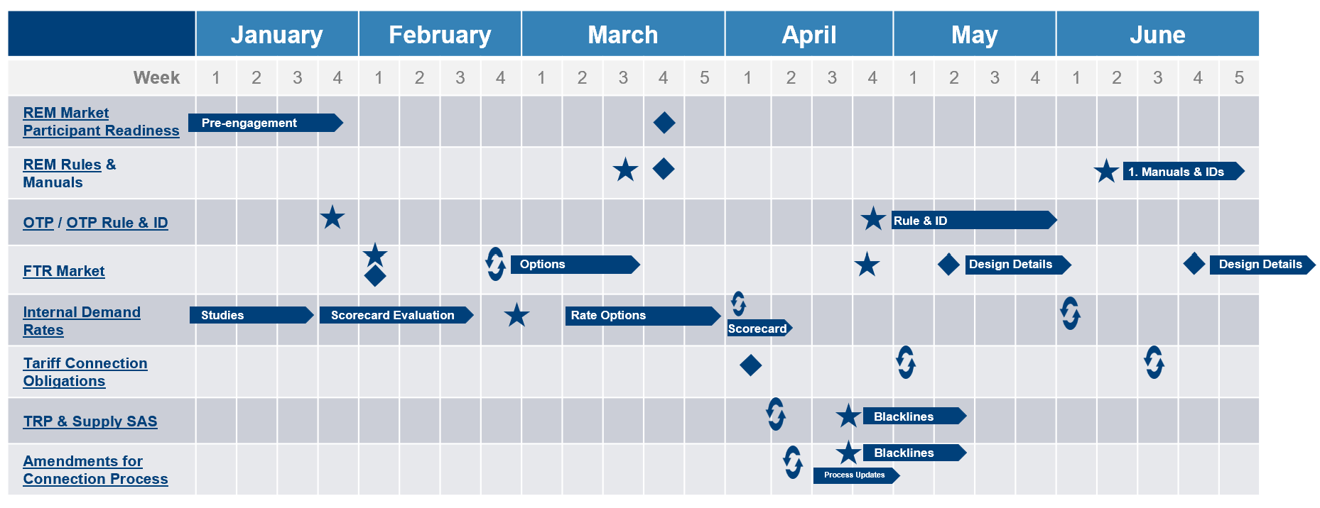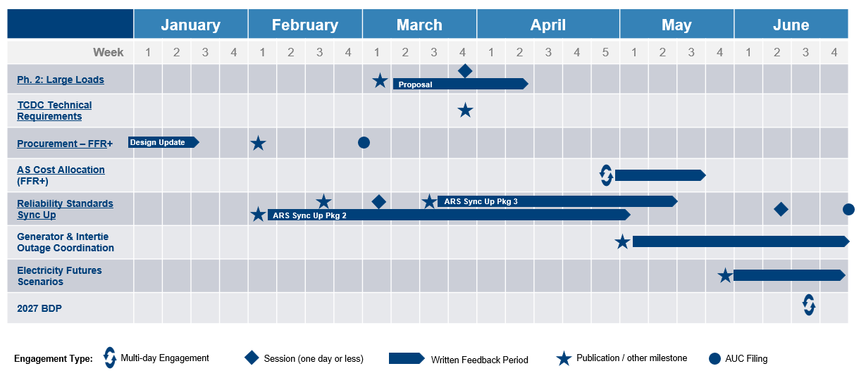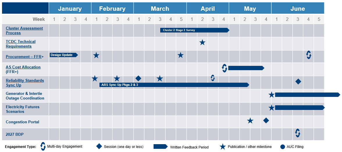 The schedule provided is current as of date published and includes general information that will be updated regularly. For specific dates, details and materials, refer to the respective project pages on AESO Engage. Stay tuned for future updates!